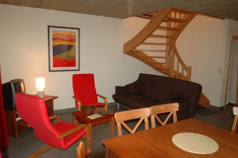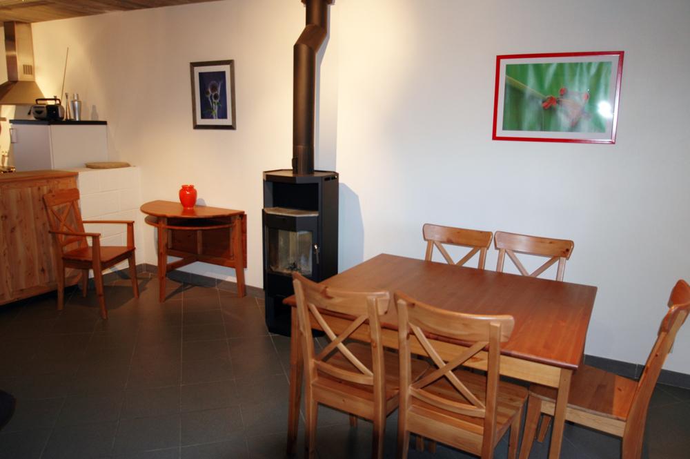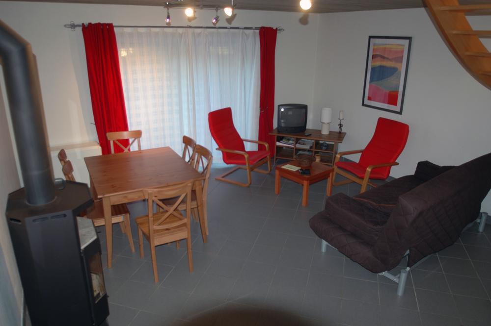 - Woonkamer : zitkamer en eet tafel, TV, houtkachel